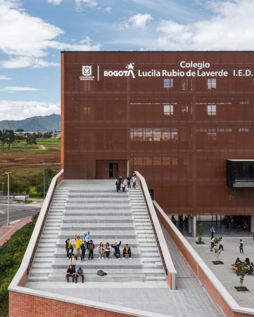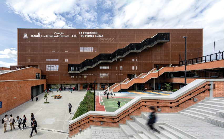 由秘鲁诺梅纳建筑事务所(Nomena Arquitectura)和当地ARE建筑事务所设计的哥伦比亚波哥大卢西亚-鲁比奥-拉维德学校(Lucila Rubio de Laverde)的穿孔金属立面上,一个突出的外部楼梯呈之字形。