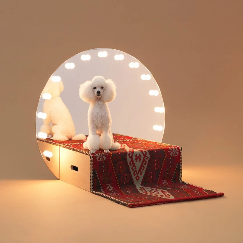 许多著名的建筑师和设计师为展览做出了贡献。隈研吾设计了一个由几何形状制成的小山状结构,供哈巴狗爬上或坐在下面,而康士坦丁-葛切奇为玩具贵宾犬设计的是一个带底座的发光镜子。
