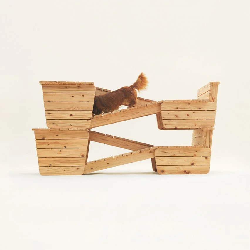 每种设计都是针对特定犬种量身定制的,结构包括坡道、靠垫、地毯和长凳。例如,展示的垂直狗屋让狗可以直视主人,从而在宠物和主人之间建立更高的互动。