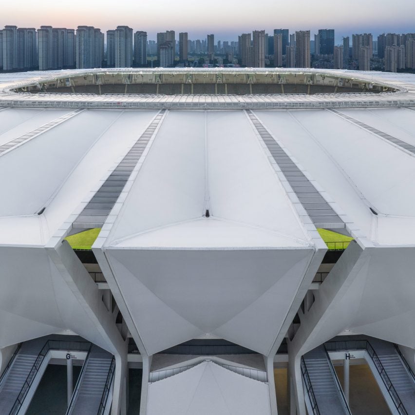 德国GMP Architekten工作室在中国完成了昆山奥林匹克体育中心(Kunshan Olympic Sports Centre),这是一座可容纳45000个座位的足球场,通过一圈高架桥和人行道“无缝连接”到公园场地。