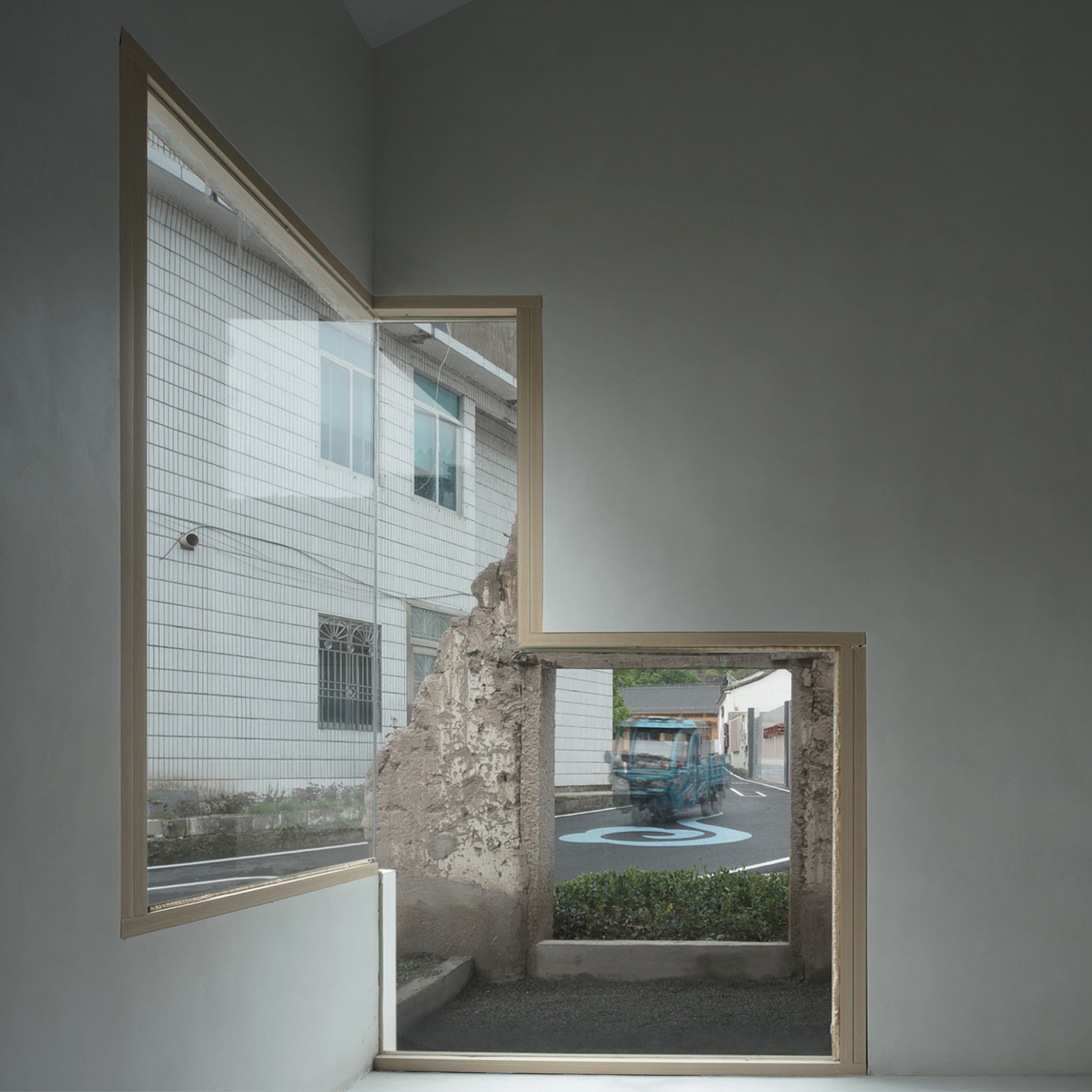王户村村民之家采用多种不同的开窗形式。整体上,咖啡厅和展厅的虚实对比是立面对内部功能逻辑差异的再现,让路上的村民也能感知室内空间功能的不同。