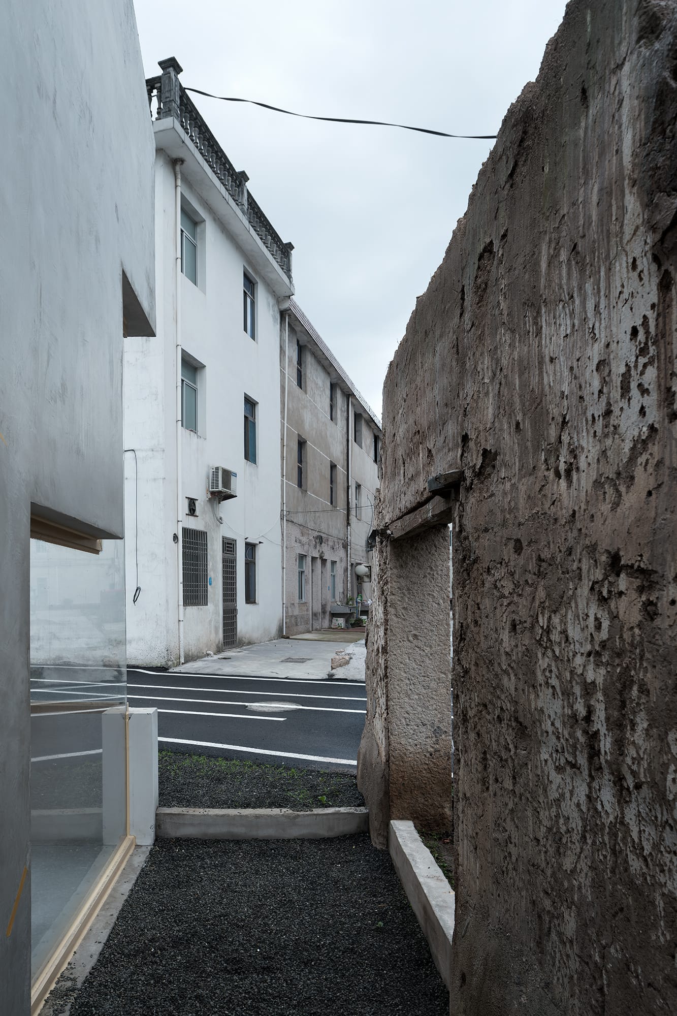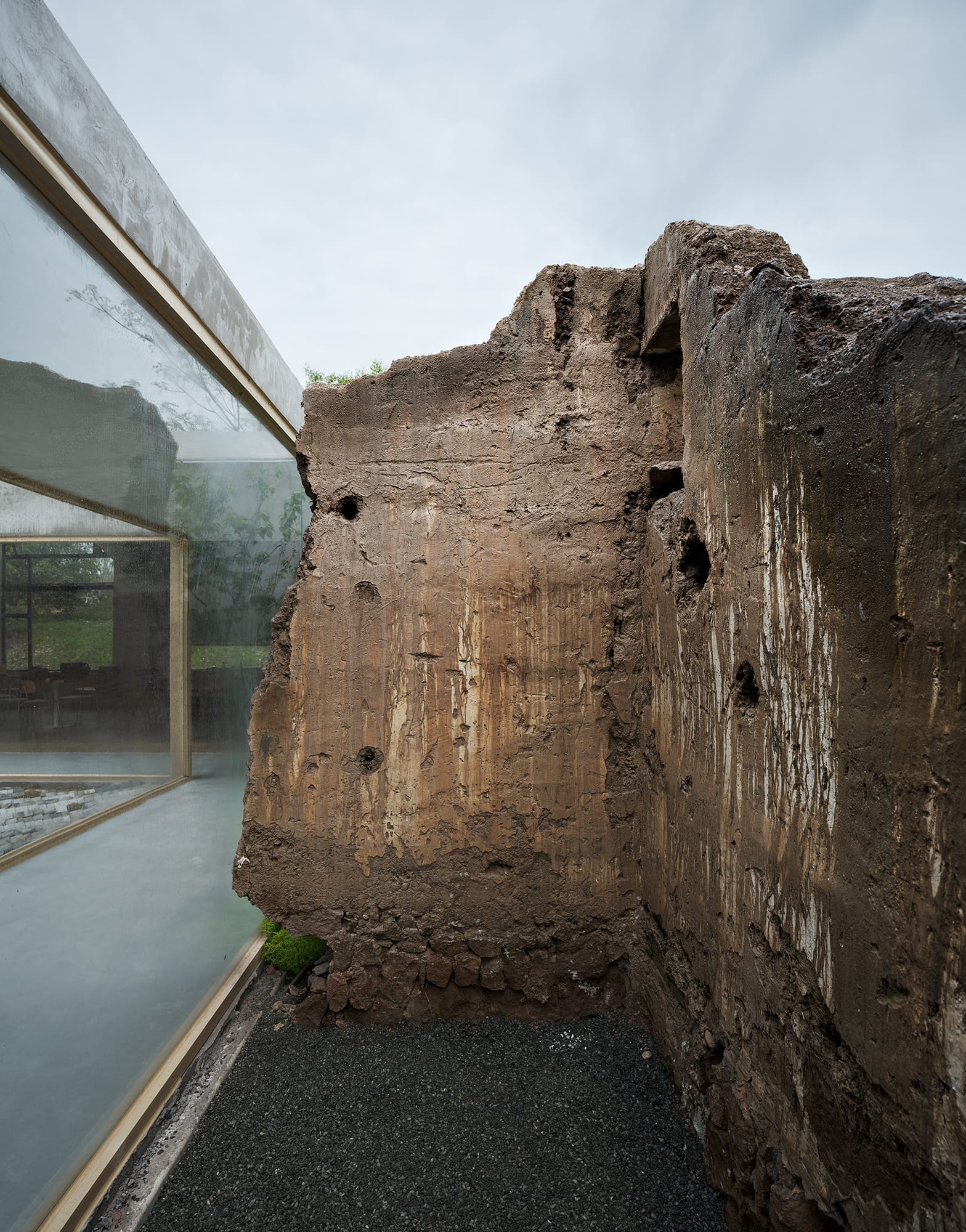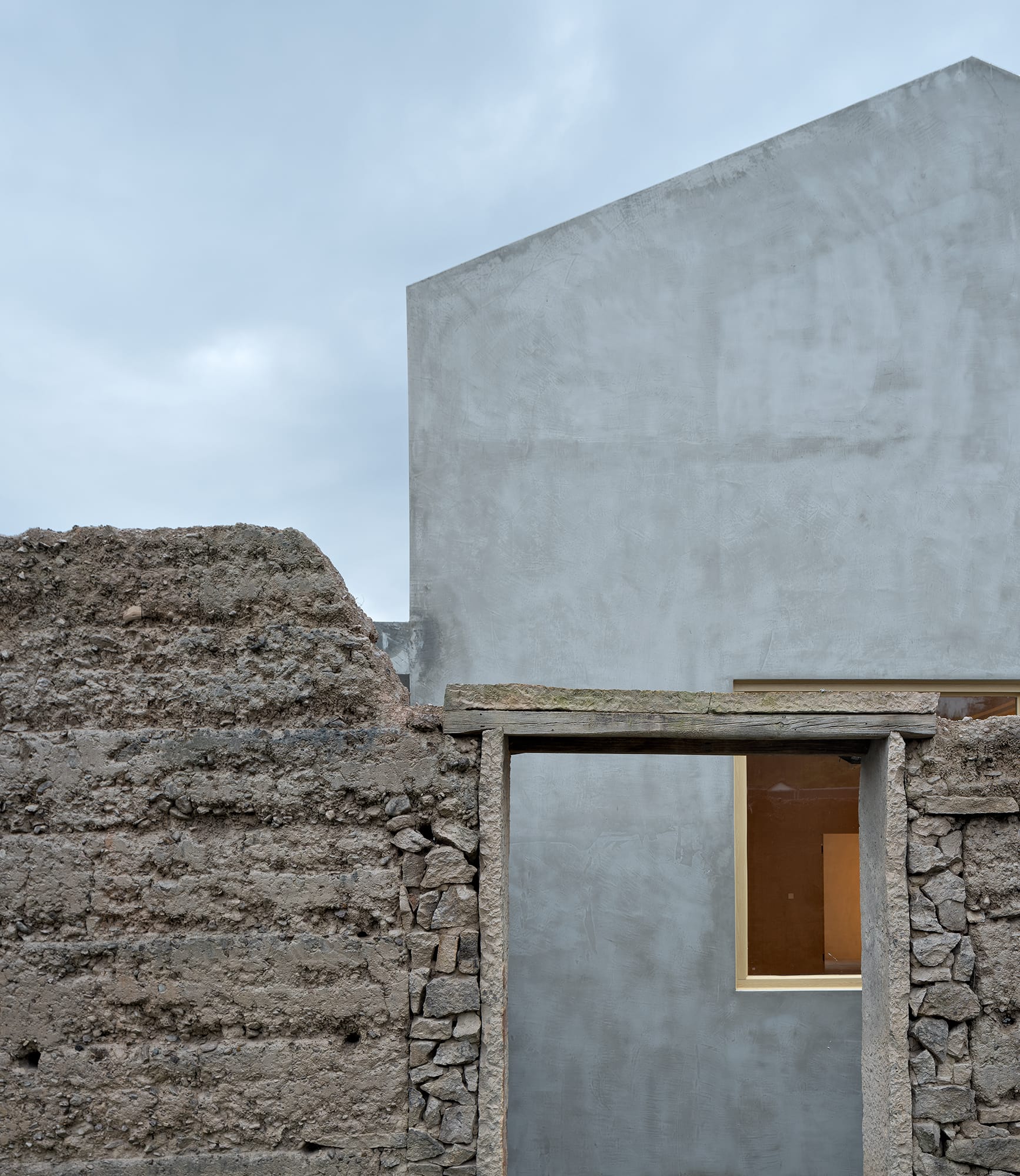 旧时民居的建造材料多为夯土墙和砖块,但夯土墙易被风化侵蚀。现状的两栋建筑,其中屋顶已坍塌,夯土老墙已老化,两者均不可作为新建筑的结构体。所以村民之家采用新的混凝土外墙,与原有夯土老墙形成鲜明对比,表达出当代新技术,且又与地块周围环境形成呼应,调和了与村落之间的冲突,形成了过去与现在之间的过渡。