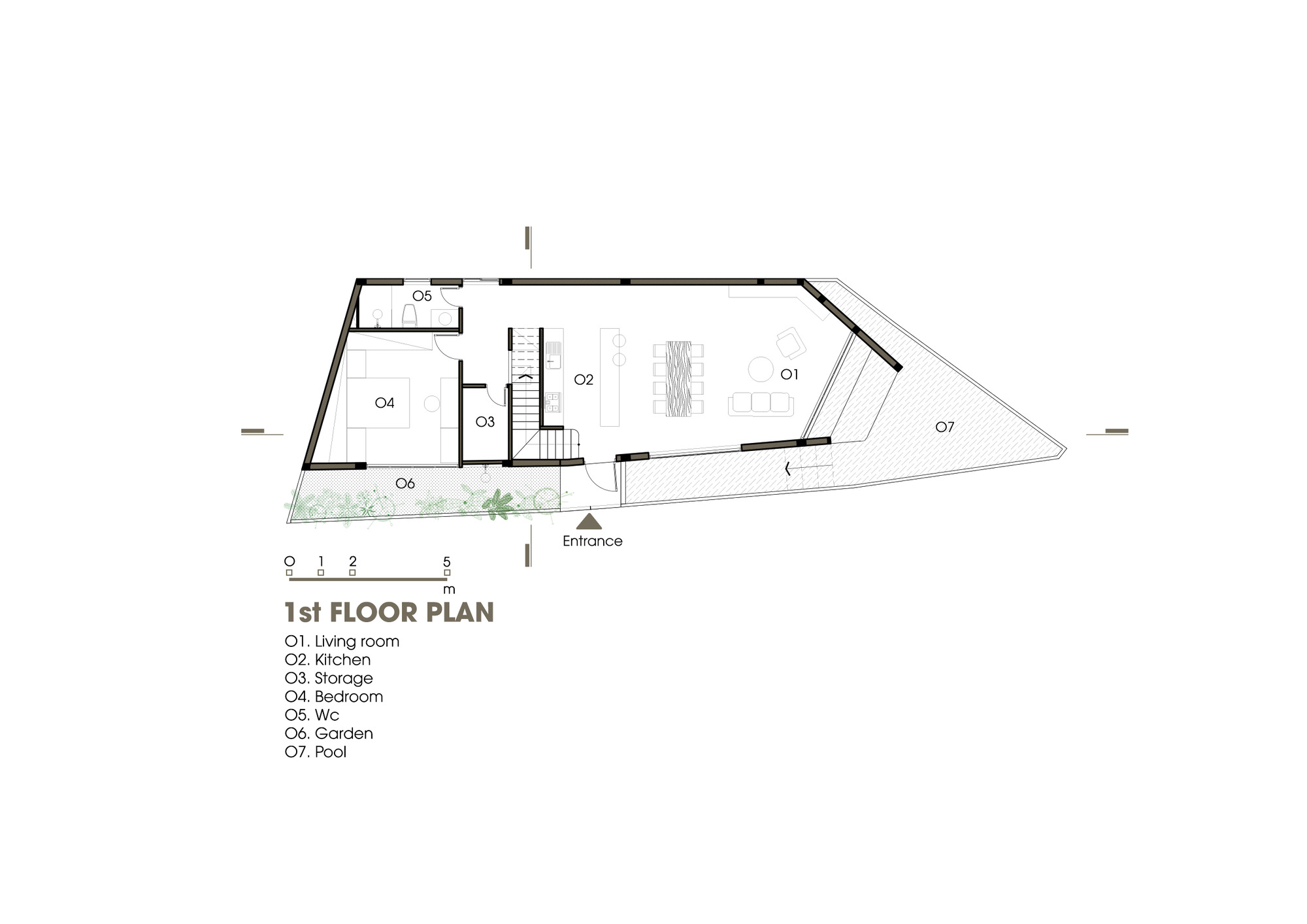 天空花园别墅的外观设计简洁而独特,以延伸的绿色区域为焦点。一楼周围战略性地种植了树木,使室内视野开阔,成为一道凉爽的绿色屏障,避免了从室外直接看到室内,确保了卧室区域的私密性。起居室周围的剩余空间点缀着一个环绕的水池,为住宅增添了便利。除了为起居室和厨房区域提供令人印象深刻的景观外,这个环绕式水池还能在炎热的日子里为室内空间降温。