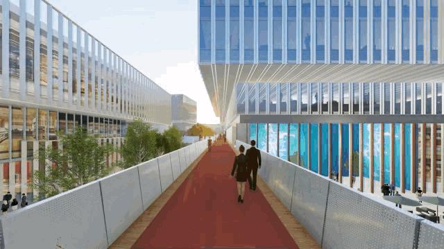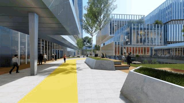 打造活力产业社区的重点在于人与人之间的互动串联,结合现代服务产业园内“人车分流”的需求,一条贯穿整个项目的公共连廊步行系统应运而生。