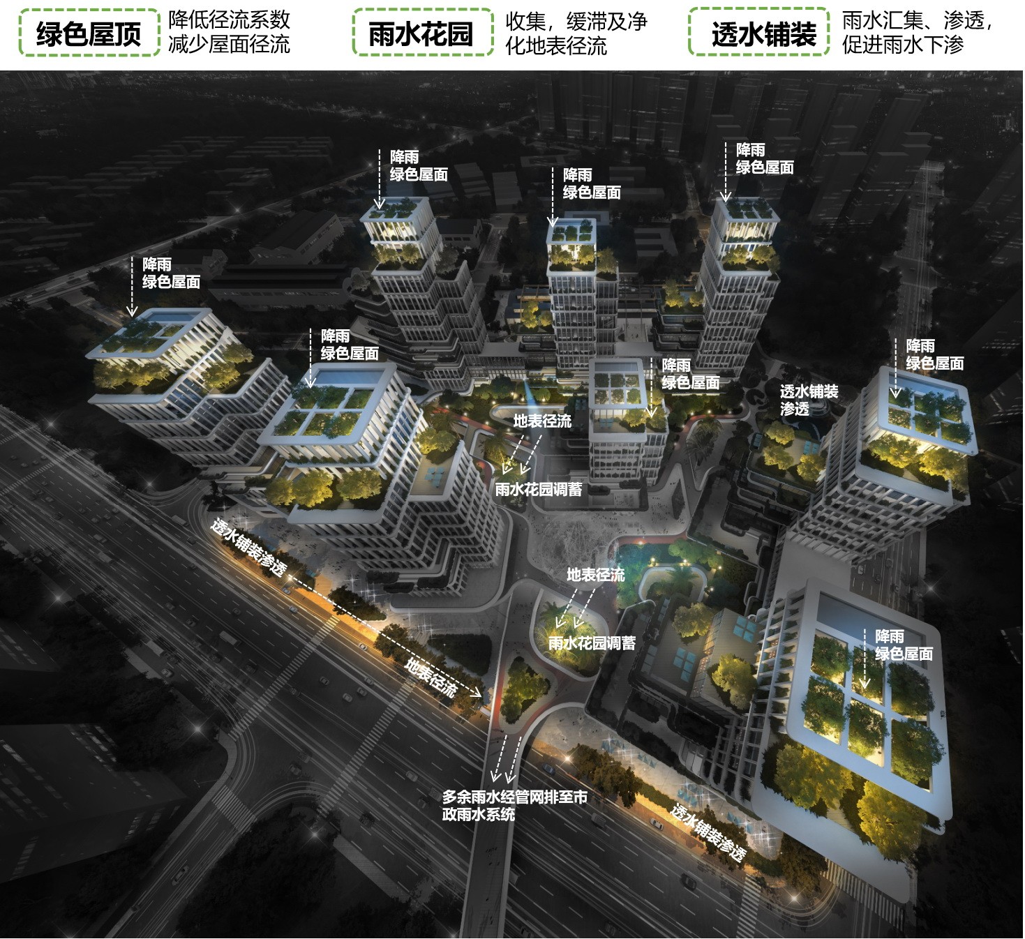在设计中充分融入海绵城市建设理念,通过设置绿色屋顶、雨水花园、透水铺装、雨水收集与回收系统,实现控制雨水径流量、节约水资源及景观功能。