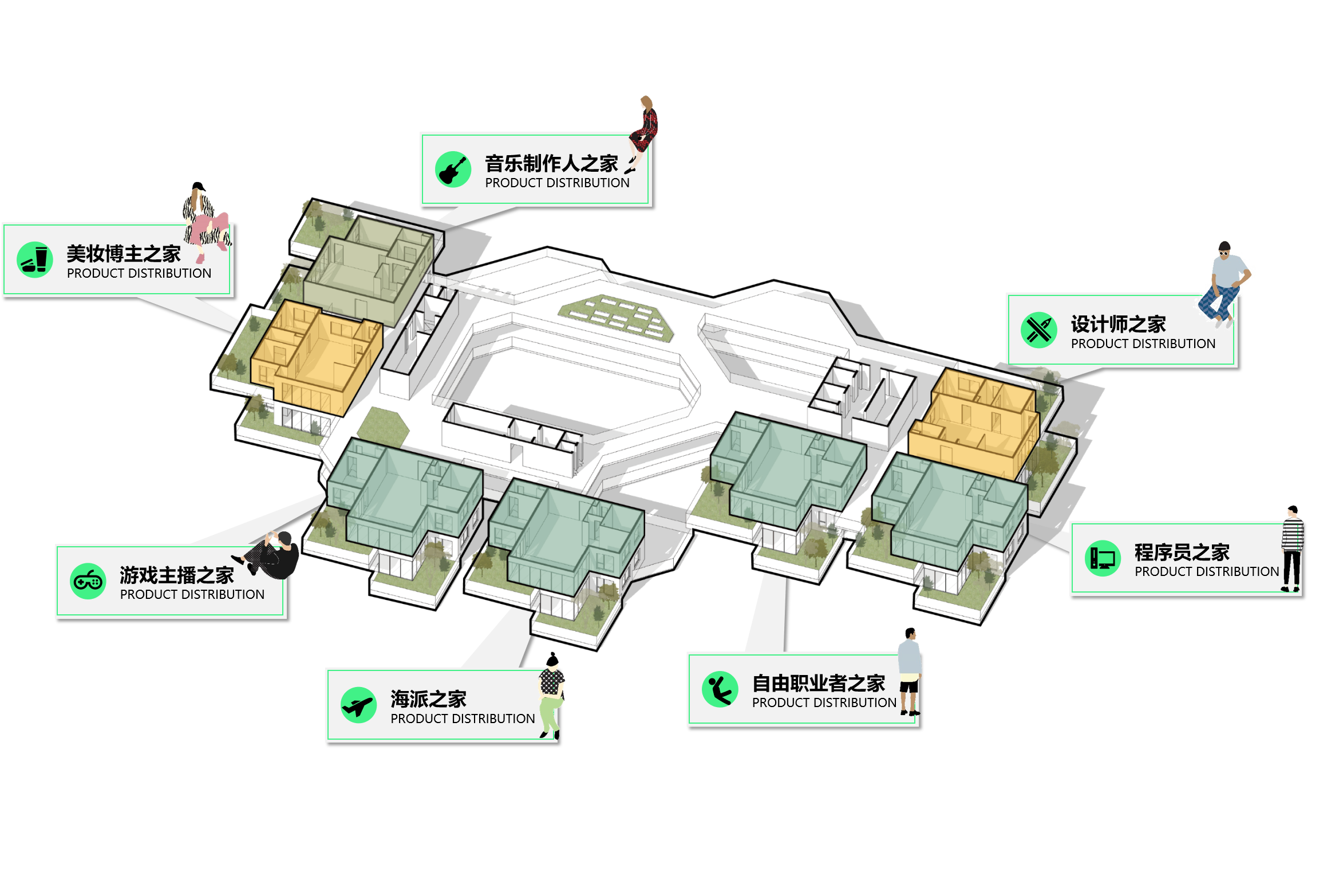 将单元化的居住空间进行自由组合并与社区功能相融合,利用连廊、大板形成二层平台,高大的架空层与灰空间提供了鲜活、亲密、多样的开放活动空间。打破传统的居住方式,利用同层共享社区、竖向公共交往空间,营造微社区生活模式。